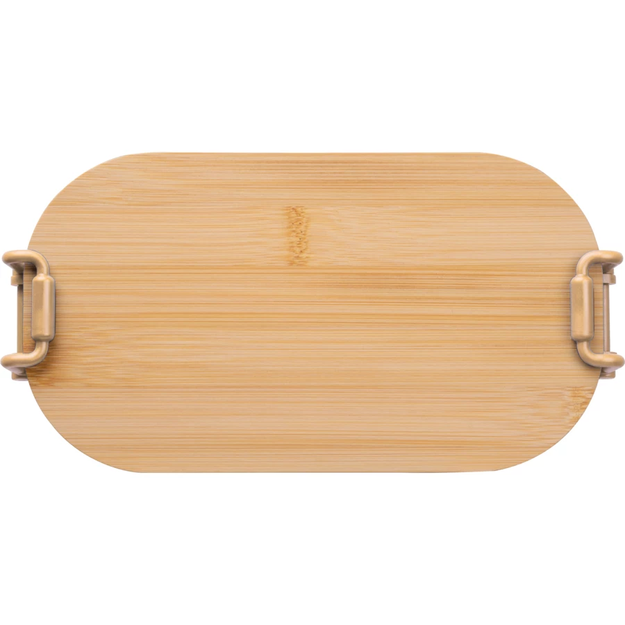 Pudełko na lunch, o pojemności 750 ml, z bambusową pokrywką i metalowymi zaciskami, zamykającymi pudełko.