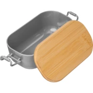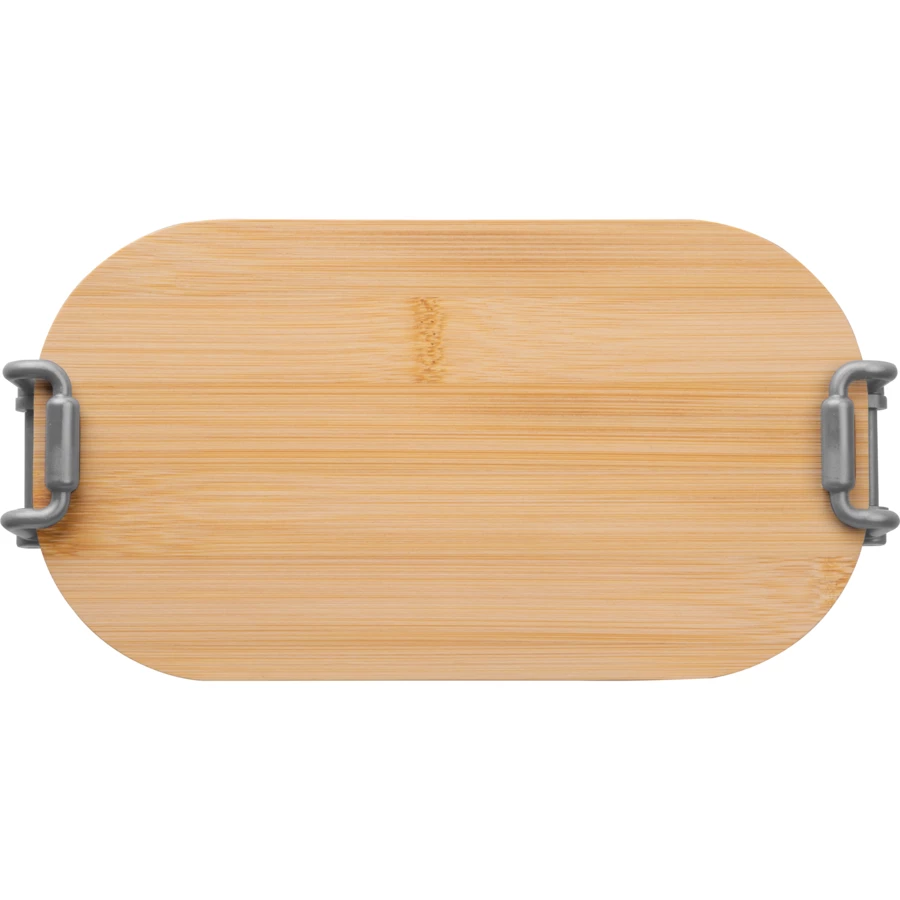 Pudełko na lunch, o pojemności 750 ml, z bambusową pokrywką i metalowymi zaciskami, zamykającymi pudełko.