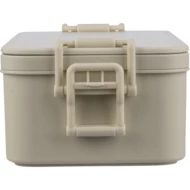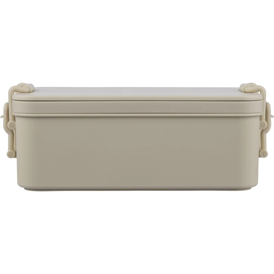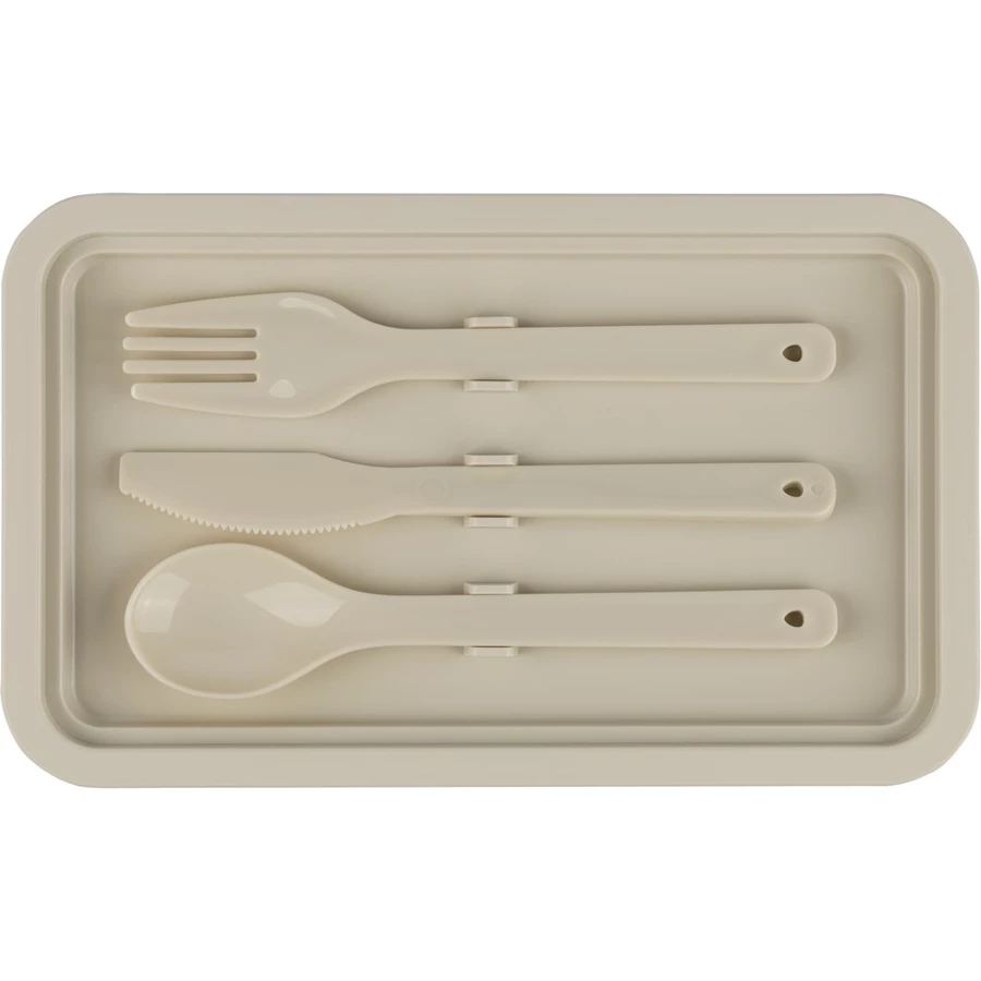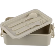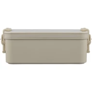 Pudełko śniadaniowe o pojemności 2,2 litra, dwie warstwy, miejsce na sztućce, zamknięcie na klips, wieczko, 3 sztućce w komplecie, produkt wykonany z PP