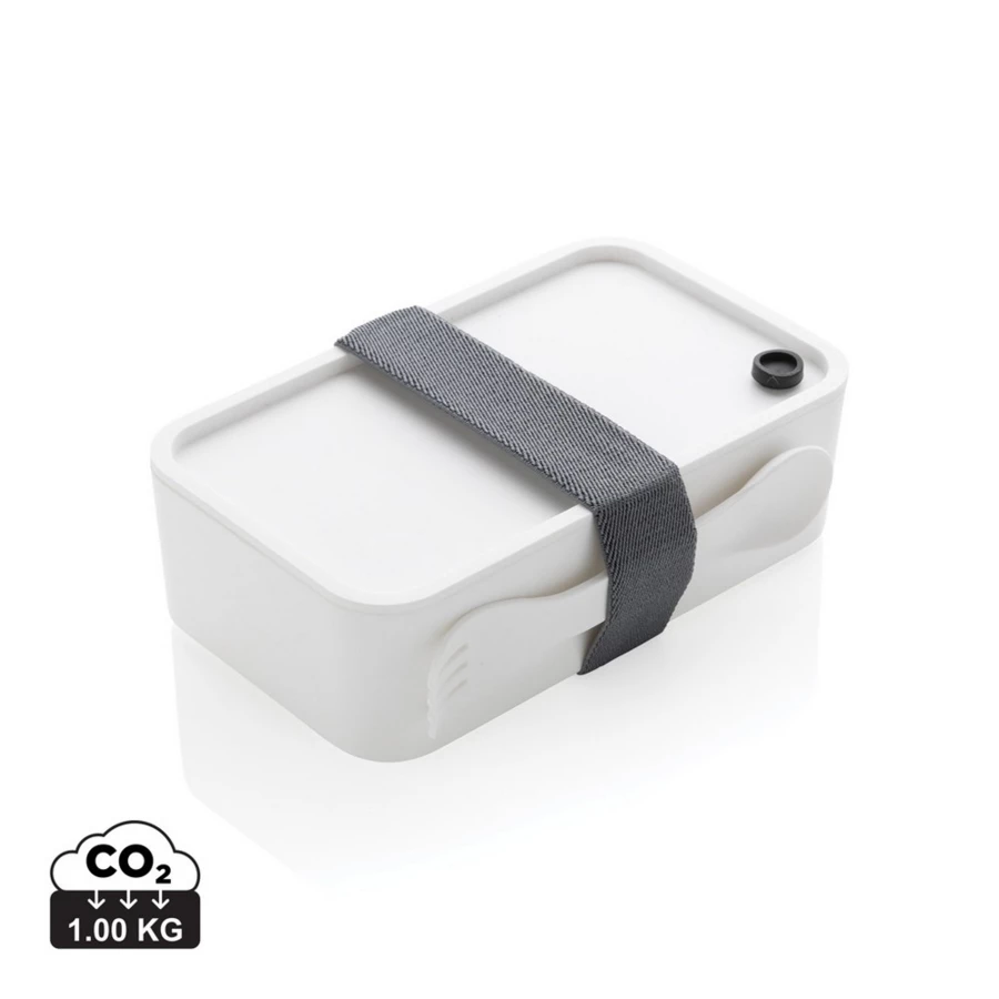 Pudełko śniadaniowe 1,2 L, lunchbox, wykonany w 93% z PP pochodzącego z recyklingu z certyfikatem GRS (Global Recycled Standard) który gwarantuje, że wykorzystane materiały pochodzą z recyklingu, w komplecie łyżkowidelec i elastyczny pasek, nie należy myć w zmywarce i używać w kuchence mikrofalowej