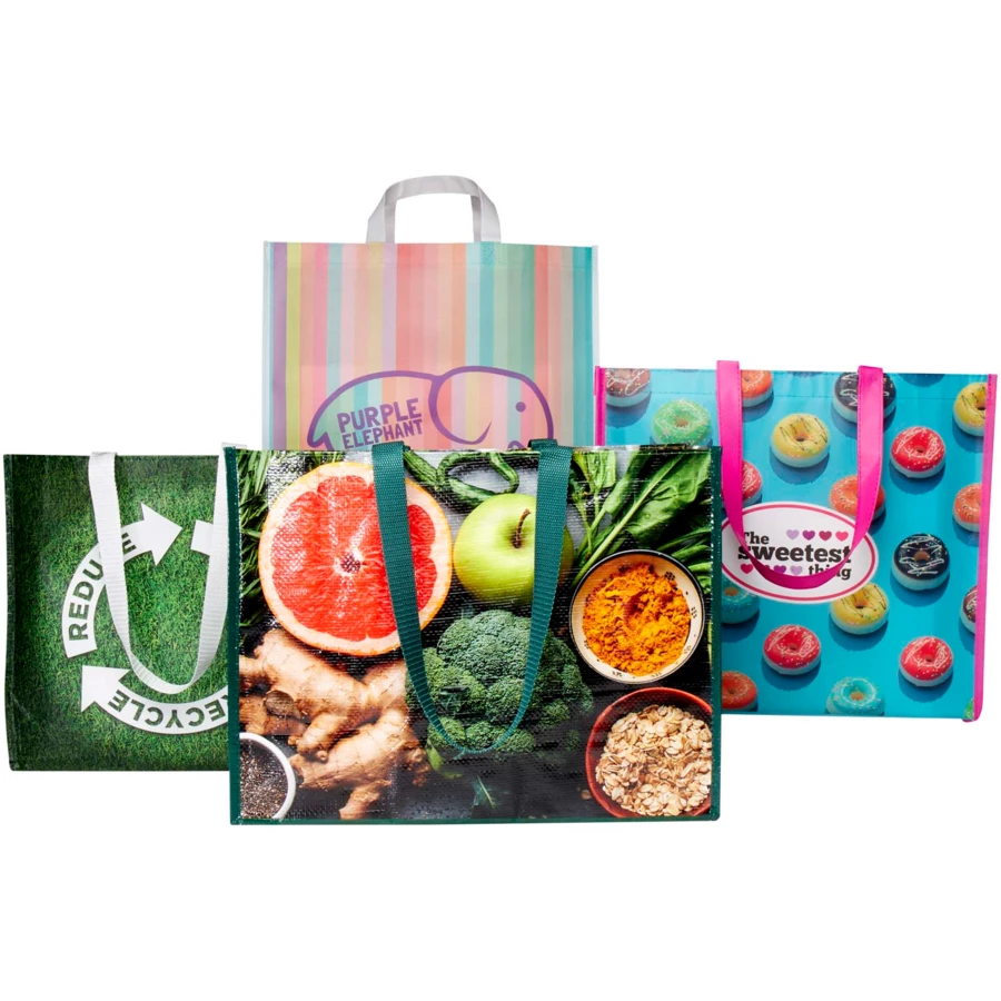 Pudełko z 4 laminowanymi torbami na zakupy w różnych rozmiarach: Laminowana tkana torba na zakupy wykonana z PET z recyklingu o gramaturze 140 g/m² (36 x 32 x 12 cm), laminowana nietkana torba na zakupy o gramaturze 120 g/m² (40 x 45 x 17 cm), laminowana nietkana torba na zakupy o gramaturze 120 g/m² (40 x 35 x 20 cm) i laminowana tkana torba na zakupy o gramaturze 140 g/m² (42 x 32 x 16 cm).