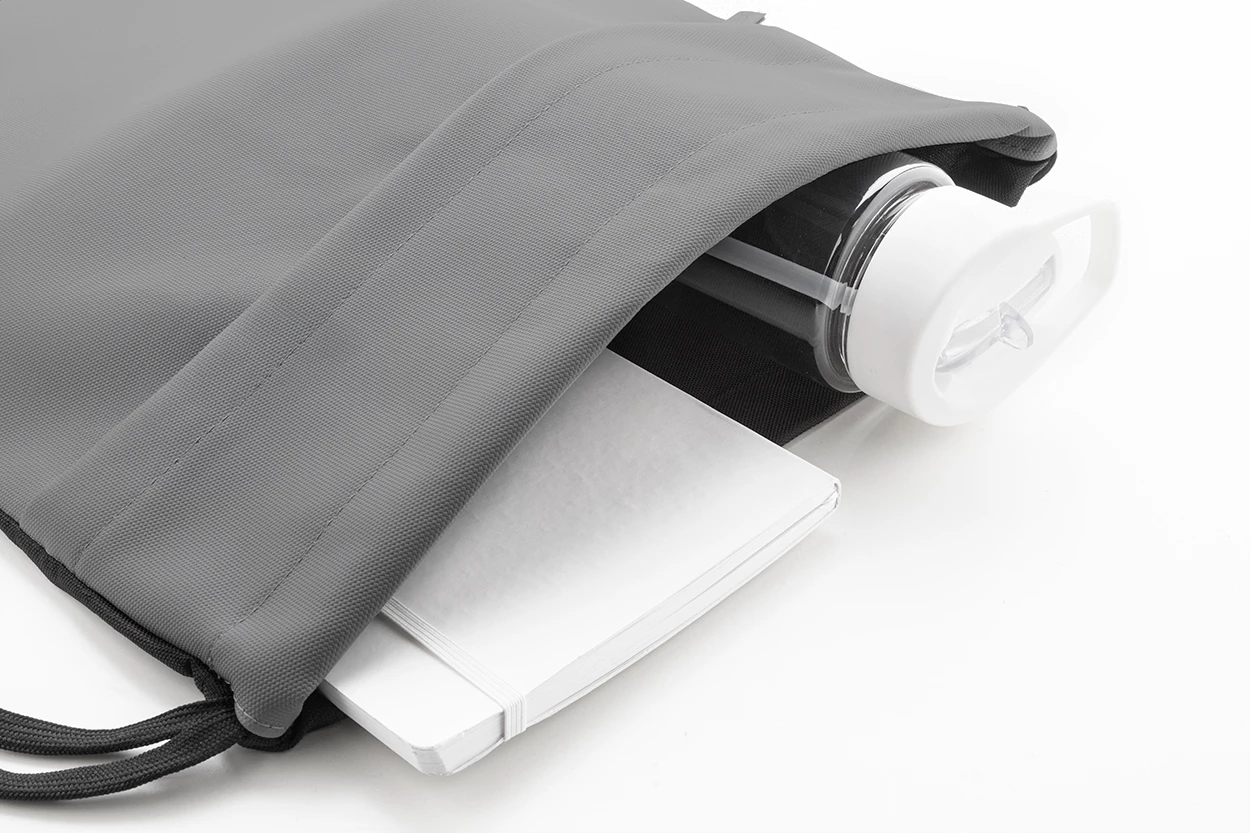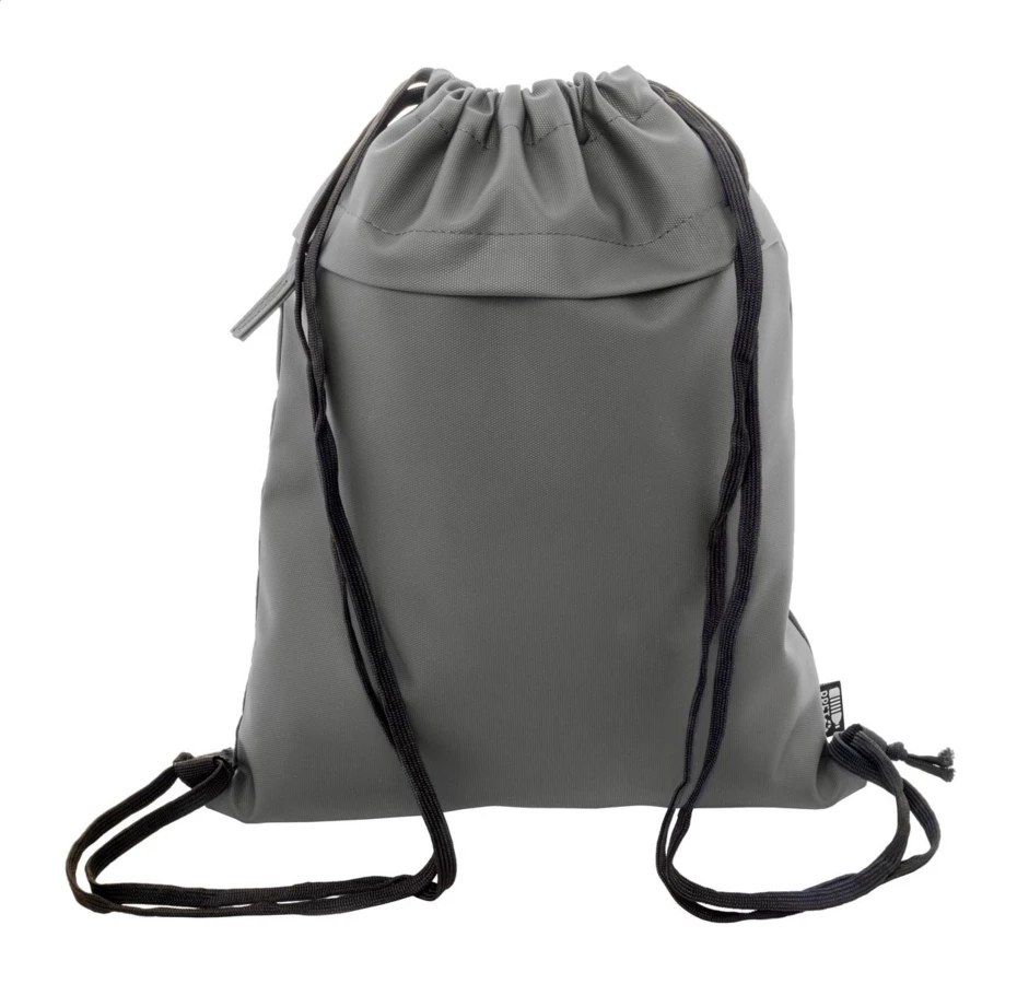 Worek ze ściągaczem RPET z przednią stroną powlekaną PU i kieszenią z przodu zapinaną na suwak. Poliester RPET 600D powlekany PU z charakterystyczną metką RPET.