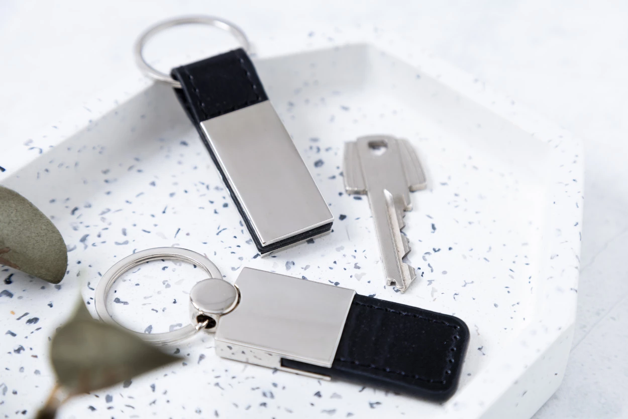 Metalowy brelok z paskiem ze skóry PU. W pudełku z papieru kraft.