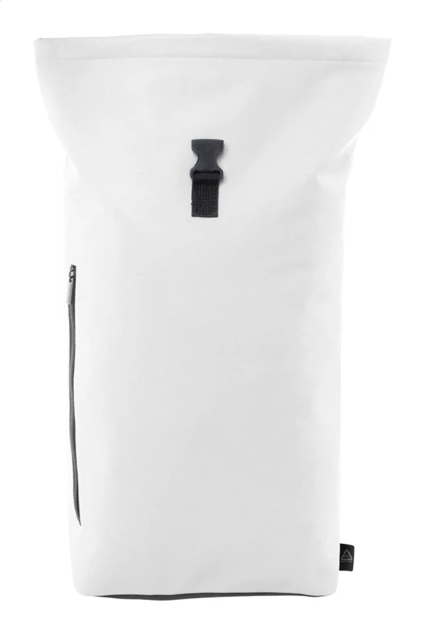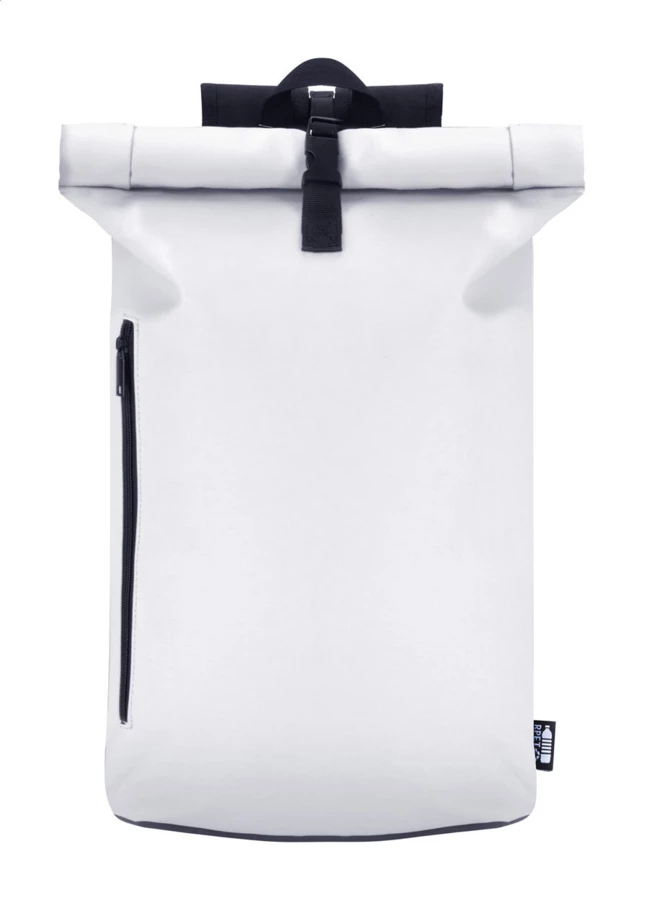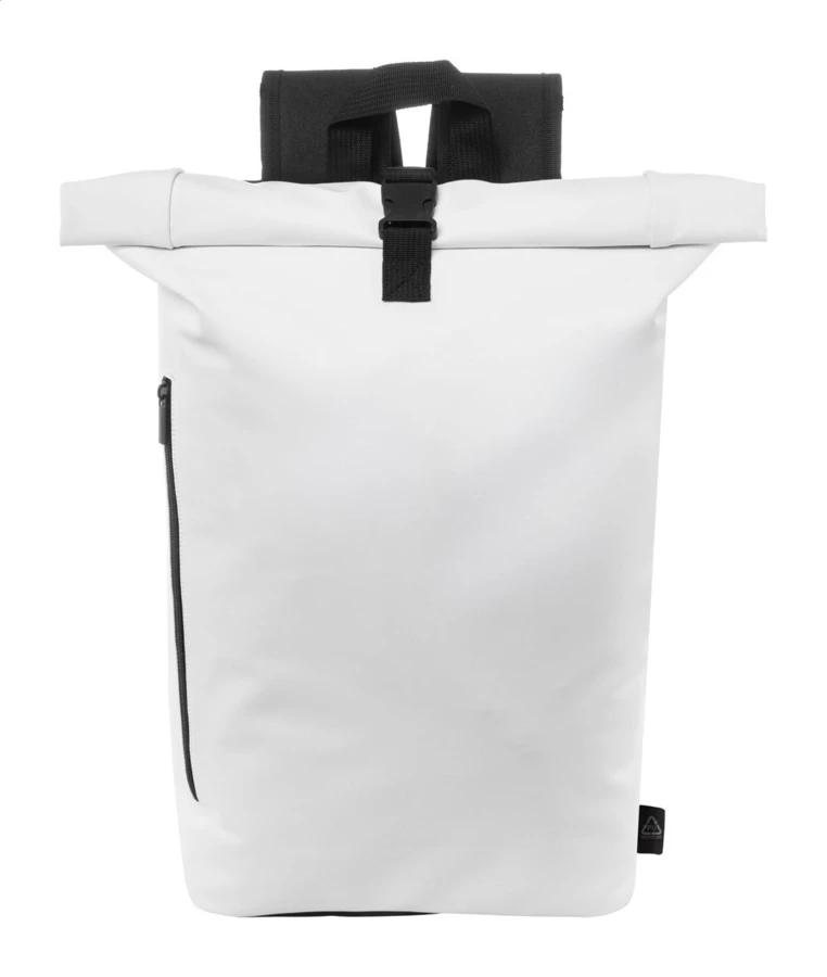 Wodoodporny, miękki plecak z recyklingowanej skóry PU z zamknięciem na klamrę, kieszenią z przodu zapinaną na zamek i wyściełaną przegrodą na laptopa (15"). Z wyściełanym tyłem i paskami na ramiona. Z charakterystyczną metką z recyklingowanego PU.