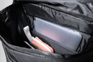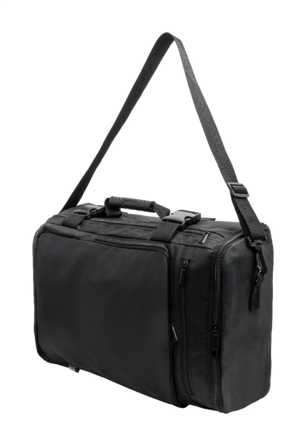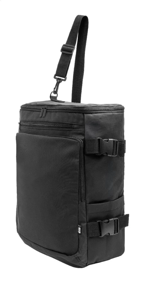 Wodoodporny, dwufunkcyjny plecak z RPET i torba na dokumenty z główną komorą zapinaną na zamek, dwiema przednimi kieszeniami zapinanymi na zamek, kieszenią boczną, bocznymi paskami z klamrą i wyściełaną przegrodą na laptopa (15"). Z wyściełanym tyłem i odpinanymi szelkami. W zestawie dodatkowy odpinany pasek na ramię do użytku jako torba na dokumenty. Wykonany z poliestru RPET 600D powlekanego poliuretanem, z charakterystyczną metką RPET.