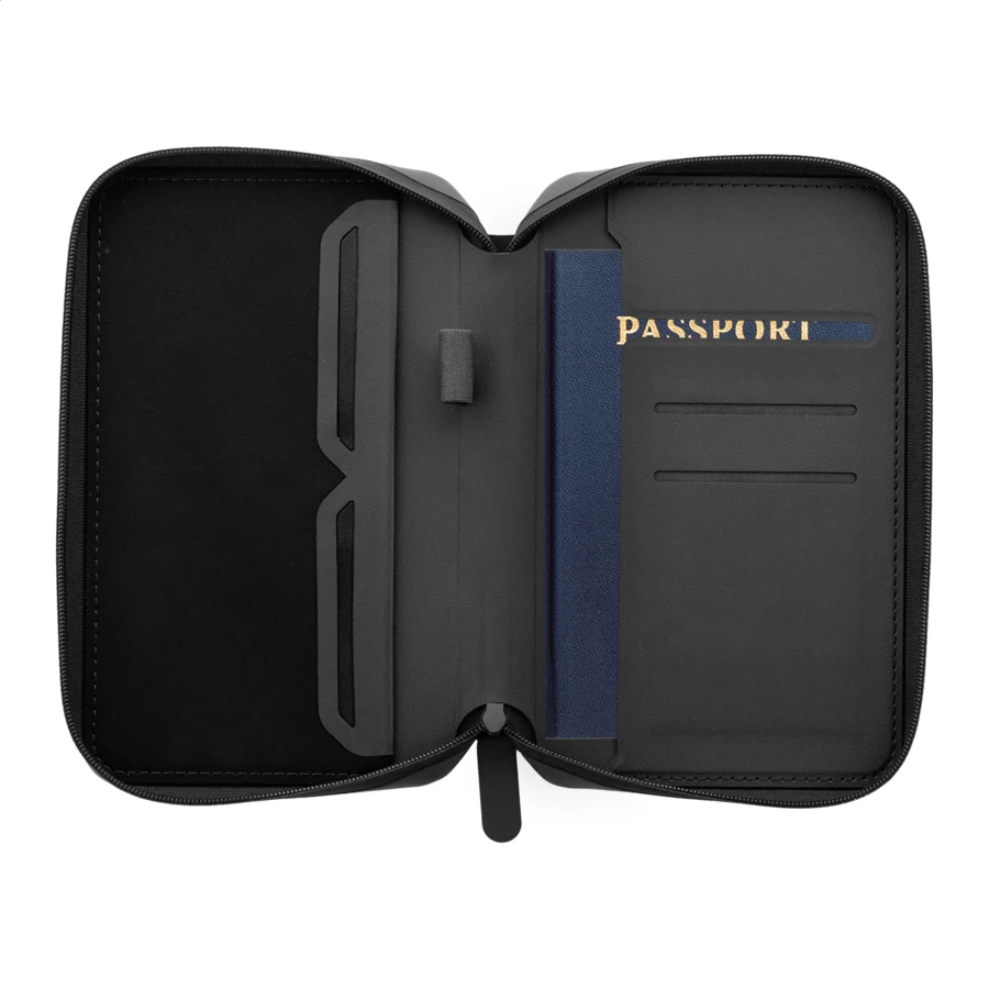 Luksusowy organizer podróżny i etui na paszport zapinane na zamek, wykonane z recyklingowanej skóry PU. Z wieloma wewnętrznymi kieszeniami na dokumenty, karty i niezbędne drobiazgi.