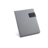 Teczka A5 wykonana z imitacji lnu i i PU. Posiada magnetyczne zamknięcie z płytką z możliwością personalizacji. Teczka zawiera blok z 40 liniowanymi stronami, podstawkę na długopis i inne przegródki na akcesoria. Długopis i akcesoria nie są dołączone do zestawu. 183 x 252 x 18 mm | Metalowa płytka: 50 x 30 mm