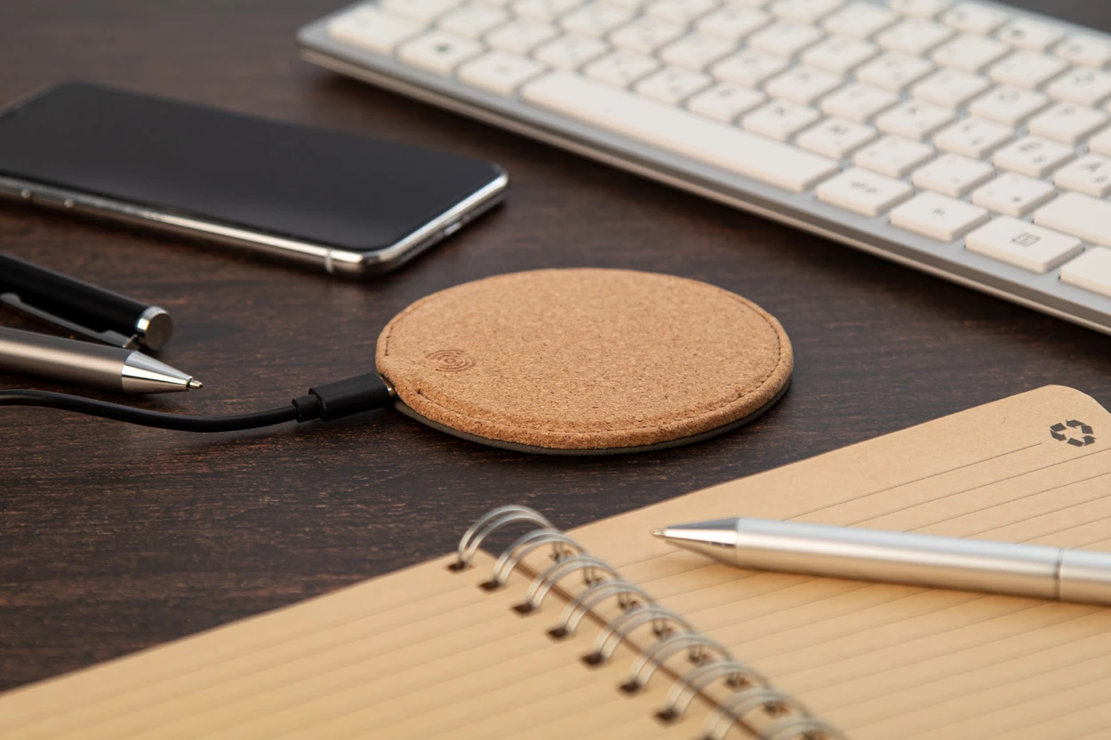 Szybka ładowarka indukcyjna pokryta naturalnym korkiem (10W) ze skórzanym spodem. Zawiera kabel USB.