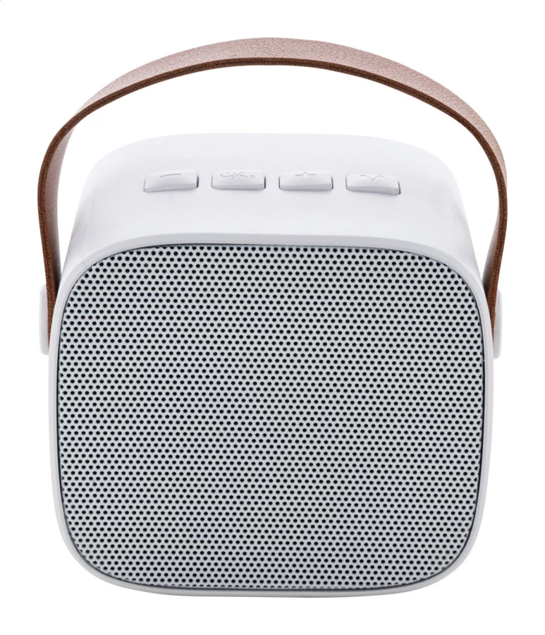 Bezprzewodowy głośnik z recyklingowanego tworzywa ABS z paskiem ze skóry PU i wbudowanym akumulatorem (1200 mAh). W zestawie kabel USB do ładowania.