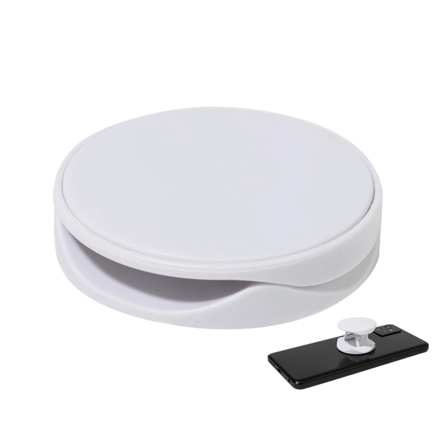 Okrągły uchwyt na telefon wykonany z recyklingowanego tworzywa ABS z samoprzylepną podstawą.