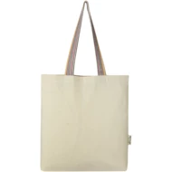 Torba na zakupy Rainbow o gramaturze 180 g/m² stanowi natychmiastowe ulepszenie zwykłej bawełnianej torby. Wykonana z przedkonsumenckiej bawełny z recyklingu, ta torba na zakupy spożywcze ma 25 cm uchwyty z tęczowej tasiemki i 3,5 cm wpust na dnie, aby zapewnić więcej miejsca do przechowywania.