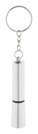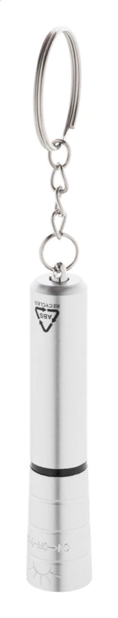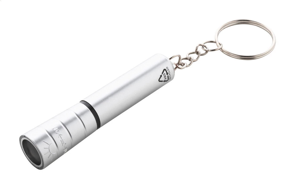 Mini latarka z 1 diodą LED z recyklingowanego plastiku ABS, z metalicznym wykończeniem i metalowym brelokiem. Z baterią guzikową.