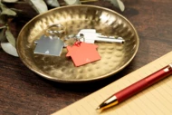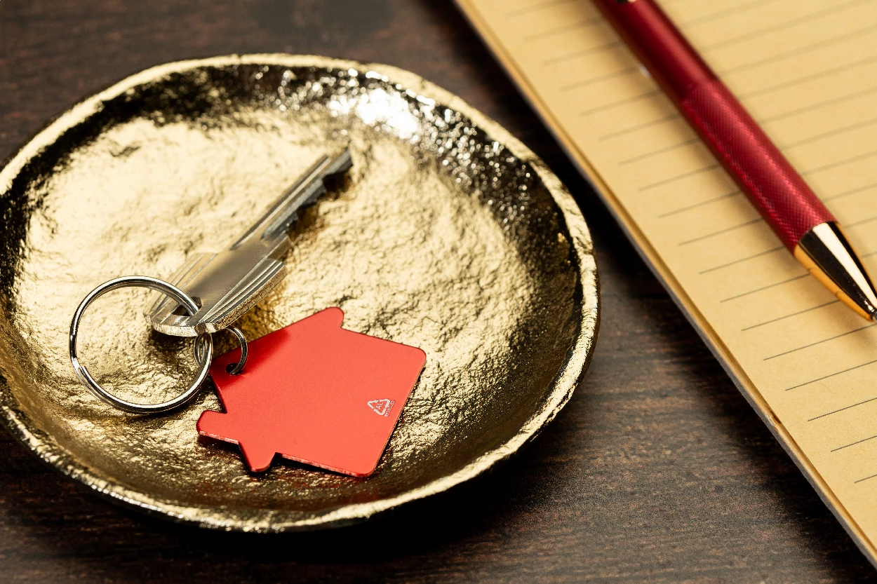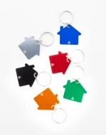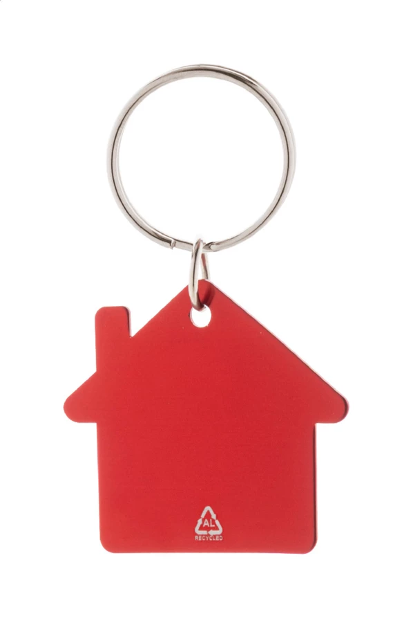 Brelok w kształcie domu, wykonany z recyklingowanego aluminium, z metalowym kółkiem.