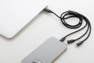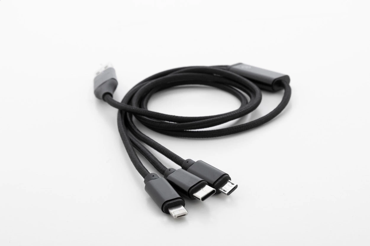 Kabel ładujący USB z recyklingowanego aluminium i RPET ze złączami micro USB, USB-C i Lightning. Z wejściami USB i USB-C. Długość kabla: 100 / 120 cm.
