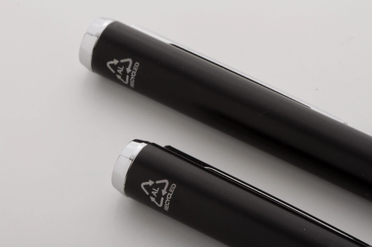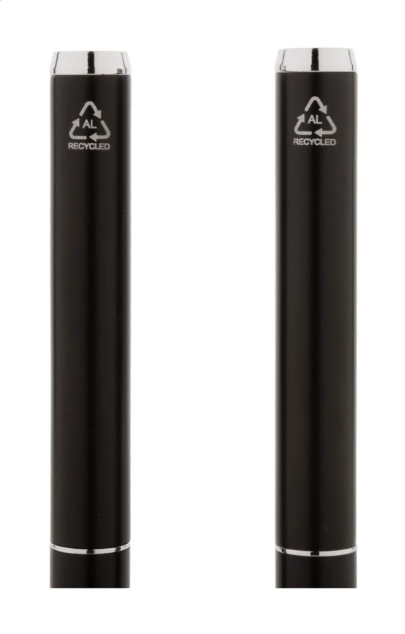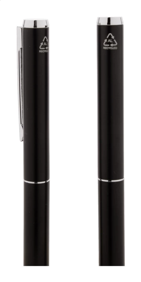 Zestaw piśmienniczy z aluminium pochodzącego z recyklingu, składający się pióra kulkowego i długopisu w pudełku upominkowym z czarnego papieru. Z niebieskim wkładem.