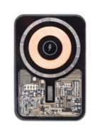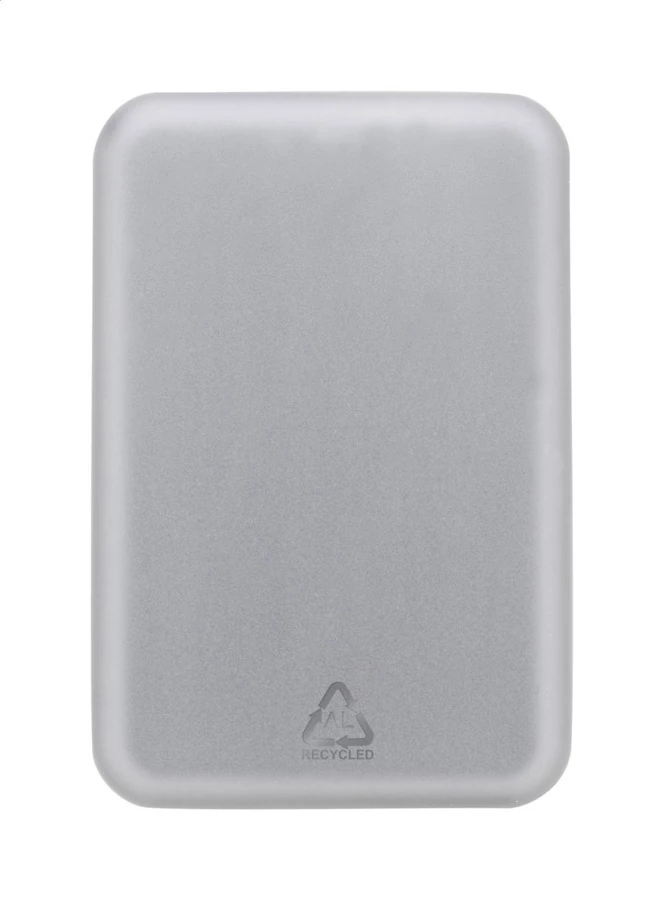 Power bank z aluminium z recyklingu z półprzezroczystą obudową i widocznymi komponentami elektronicznymi. Z baterią 5000 mAh i wbudowaną magnetyczną szybką ładowarką bezprzewodową (15 W). Z wejściem USB-C i portem ładowania. Zawiera samoprzylepny metalowy pierścień do korzystania z funkcji magnetycznej na dowolnym urządzeniu z możliwością ładowania bezprzewodowego. Zgodny z iPhone® 12 lub nowszym. Zawiera kabel do ładowania USB.