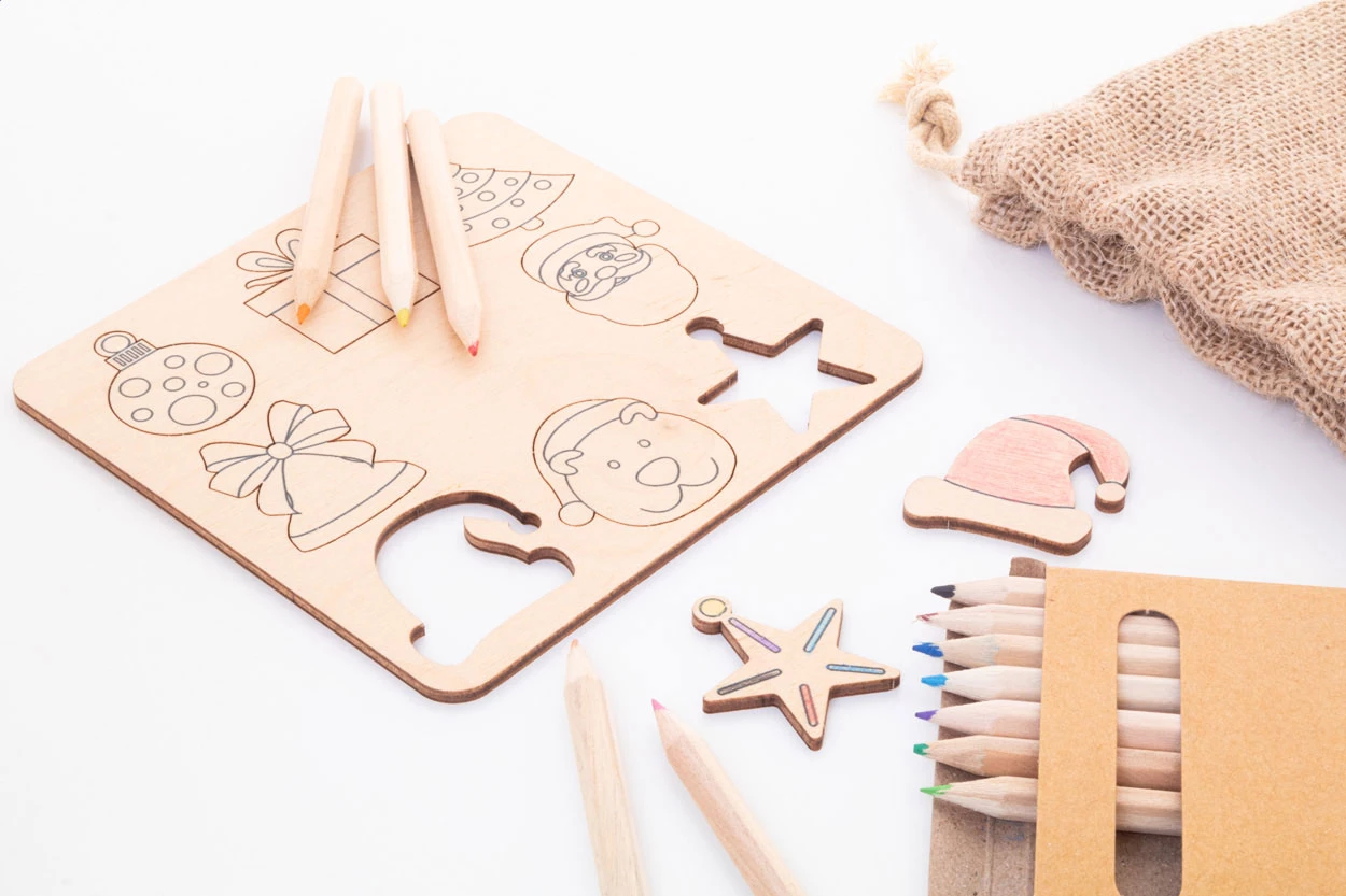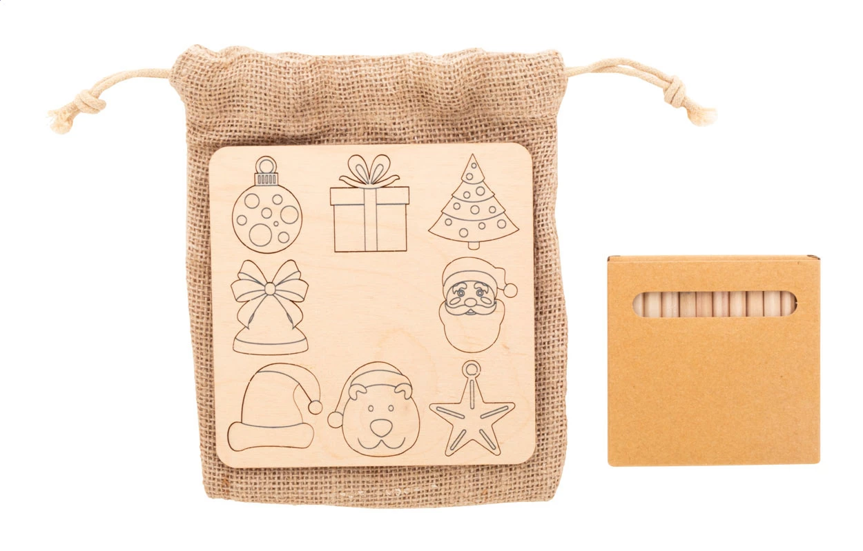 Świąteczna gra polegająca na dopasowywaniu kształtów, wykonana ze sklejki brzozowej, którą można kolorować, z jutowym woreczkiem. Zawiera tematyczne wycięte figurki (8 szt.) i drewniane kredki (12 szt.) w papierowym pudełku.
