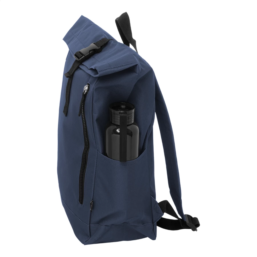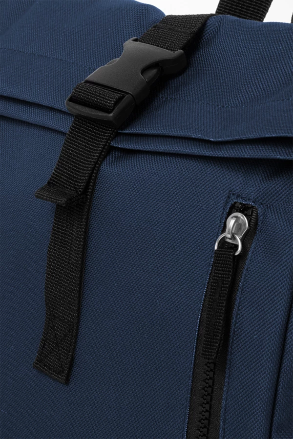 Plecak zwijany RPET z zapięciem na klamrę, przegrodą na laptopa (14") i przednią kieszenią zapinaną na zamek. Z wyściełanymi plecami i paskami naramiennymi Poliester 600D RPET z charakterystyczną metką RPET.