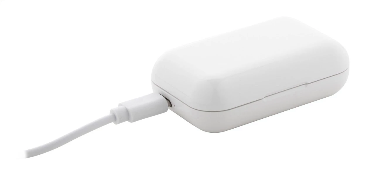Bezprzewodowe słuchawki stereo (TWS) z tworzywa ABS pochodzącego z recyklingu, z funkcją zestawu głośnomówiącego, w plastikowej obudowie z akumulatorem 400 mAh. W zestawie kabel USB do ładowania.