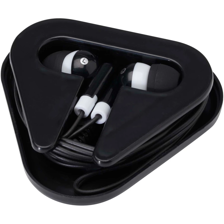 Słuchawki douszne Rebel to proste słuchawki douszne, których można używać z dowolnym standardowym urządzeniem audio z gniazdem audio 3,5 mm. Słuchawki douszne są umieszczone w trójkątnym etui z miejscem na kabel, wykonanym z plastiku pochodzącego z recyklingu, które dobrze chroni je przed uszkodzeniami zewnętrznymi.