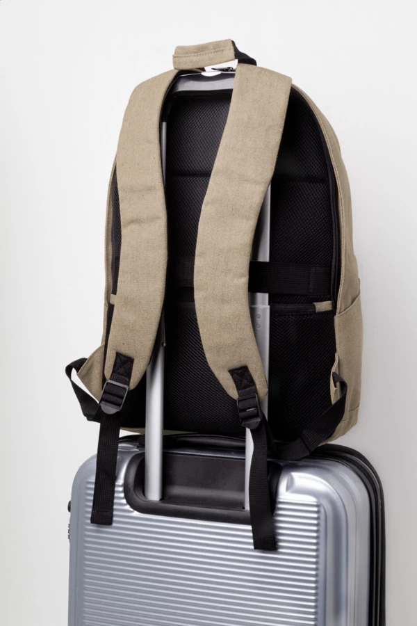 Plecak z płótna z recyklingu z główną kieszenią na suwak, wyściełaną przegrodą na laptopa (15"), kieszenią z przodu na suwak, kieszeniami bocznymi, paskiem do walizki, wyściełanymi plecami i paskami naramiennymi. Z ukrytą kieszenią antykradzieżową. 70% bawełny z recyklingu i 30% poliestru RPET. Z charakterystyczną metką z bawełny z recyklingu.