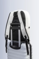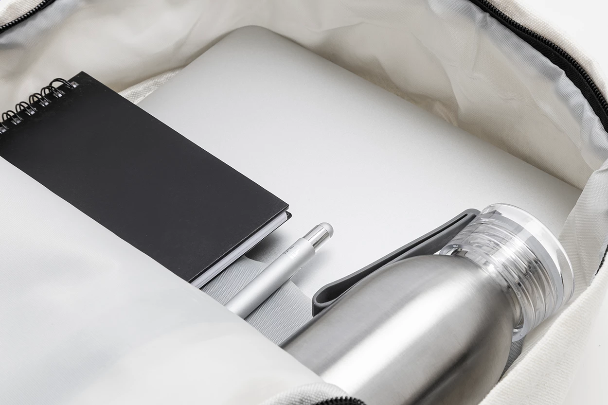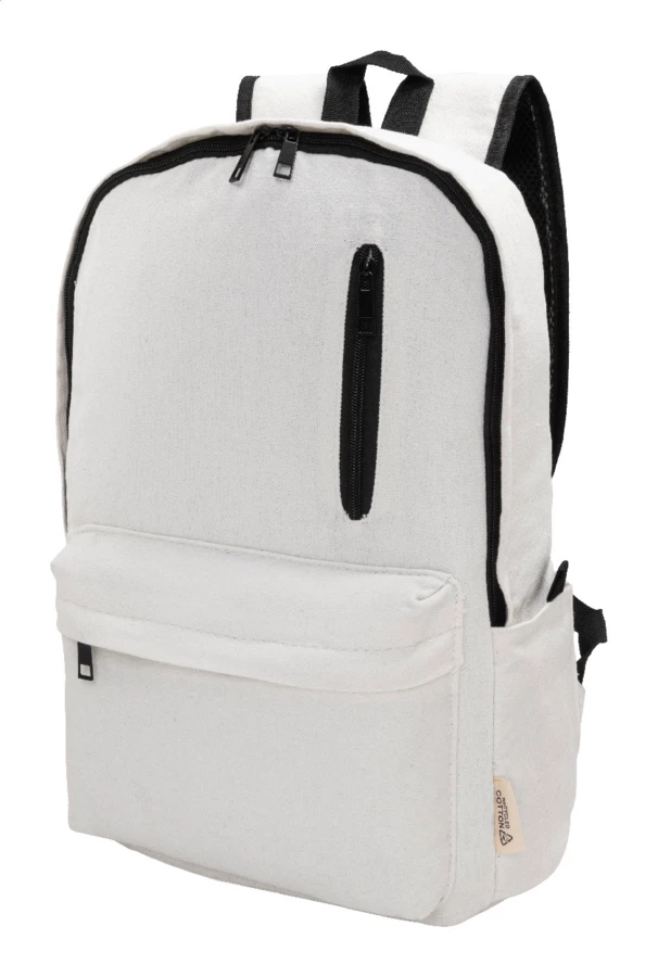 Plecak z płótna z recyklingu z główną komorą zapinaną na zamek, wyściełaną przegrodą na laptopa (15"), 2 kieszeniami z przodu zapinanymi na zamek, kieszeniami bocznymi, paskiem do noszenia na walizce, wyściełanymi plecami i paskami na ramię. Wykonany w 70% z bawełny z recyklingu i w 30% z poliestru RPET. Z charakterystyczną metką z bawełny z recyklingu.