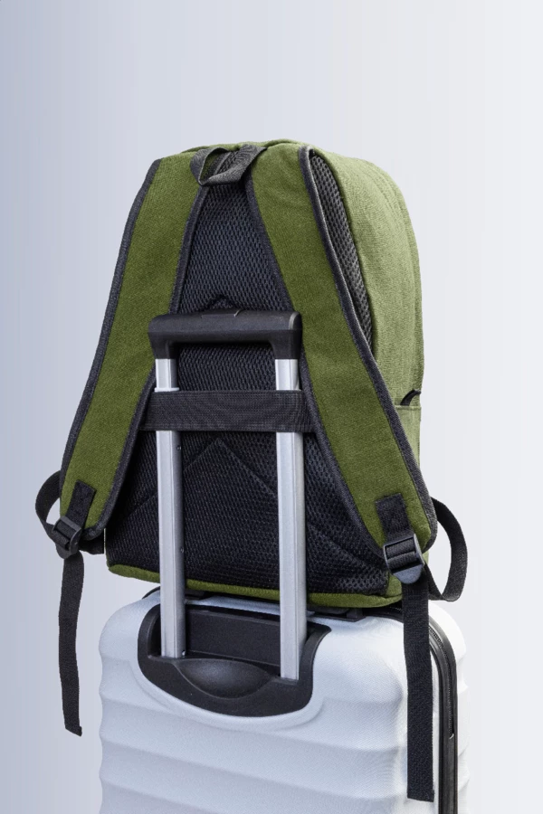 Plecak z płótna z recyklingu z główną komorą zapinaną na zamek, wyściełaną przegrodą na laptopa (15"), 2 kieszeniami z przodu zapinanymi na zamek, kieszeniami bocznymi, paskiem do noszenia na walizce, wyściełanymi plecami i paskami na ramię. Wykonany w 70% z bawełny z recyklingu i w 30% z poliestru RPET. Z charakterystyczną metką z bawełny z recyklingu.