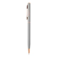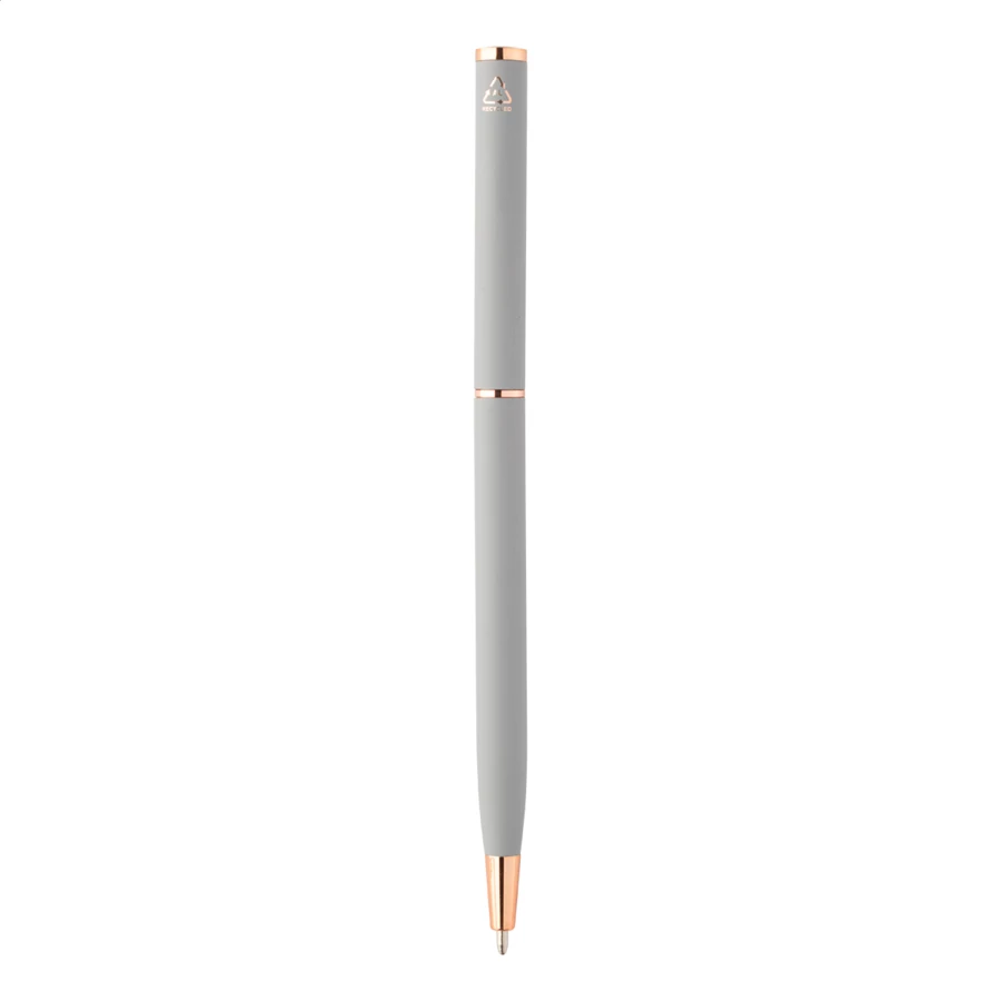 Przekręcany długopis z aluminium pochodzącego z recyklingu, z gumowanym wykończeniem i detalami w kolorze różowego złota.Ze specjalną powłoką pod grawer lustrzany w kolorze różowego złota. Z niebieskim wkładem.