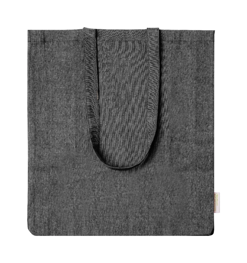 Torba na zakupy z bawełny pochodzącej z recyklingu z szerokim dnem, długimi uchwytami i charakterystyczną metką informującą o bawełnie pochodzącej z recyklingu. 100% bawełna z recyklingu, 140 g/m².