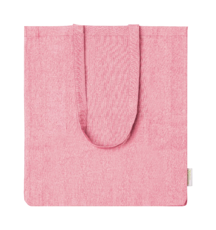 Torba na zakupy z bawełny pochodzącej z recyklingu z szerokim dnem, długimi uchwytami i charakterystyczną metką informującą o bawełnie pochodzącej z recyklingu. 100% bawełna z recyklingu, 140 g/m².