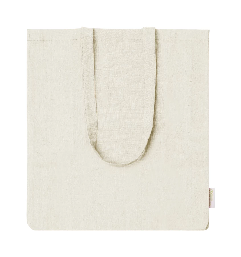 Torba na zakupy z bawełny pochodzącej z recyklingu z szerokim dnem, długimi uchwytami i charakterystyczną metką informującą o bawełnie pochodzącej z recyklingu. 100% bawełna z recyklingu, 140 g/m².