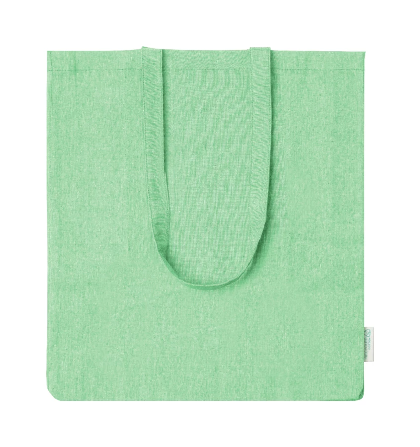 Torba na zakupy z bawełny pochodzącej z recyklingu z szerokim dnem, długimi uchwytami i charakterystyczną metką informującą o bawełnie pochodzącej z recyklingu. 100% bawełna z recyklingu, 140 g/m².
