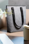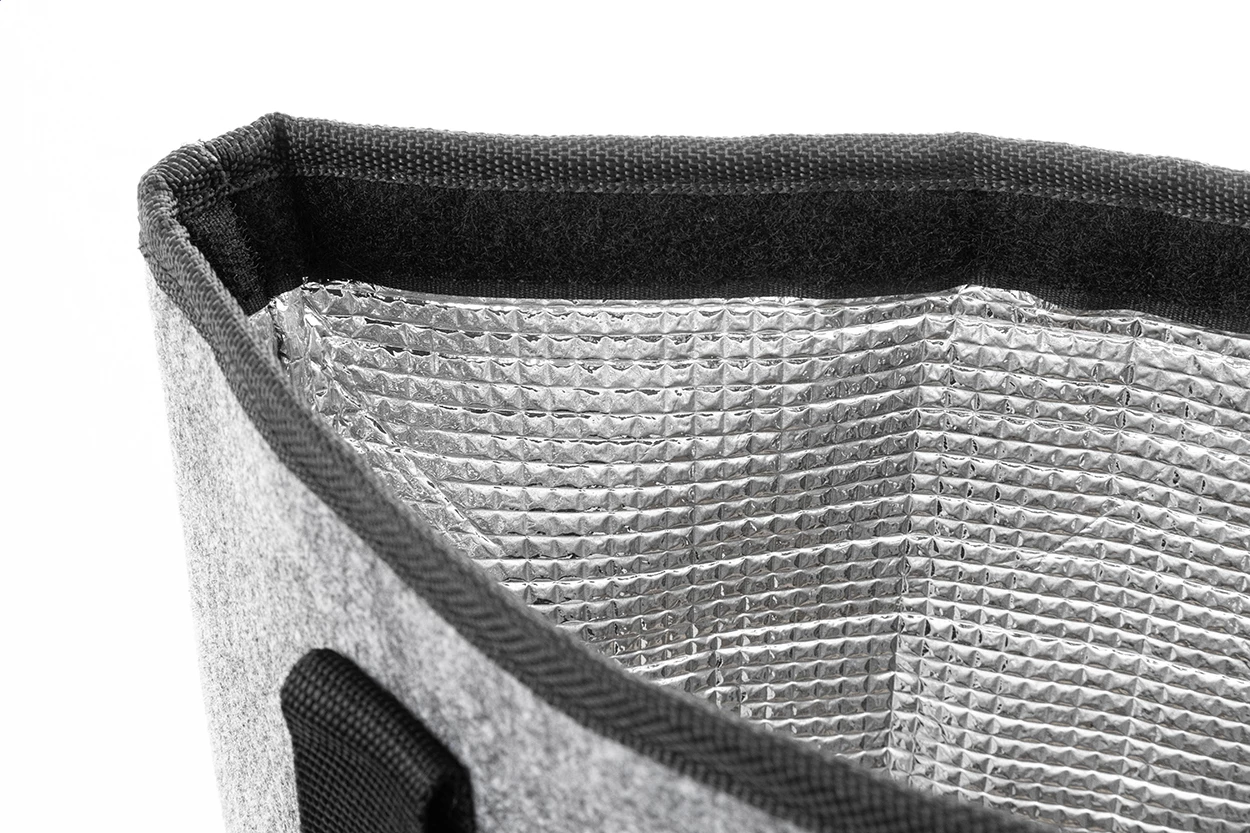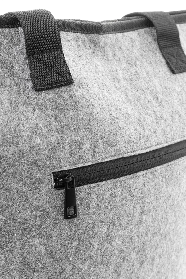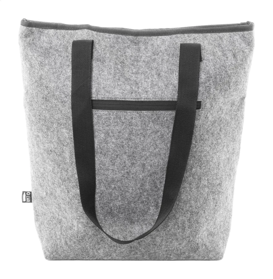 Torba termiczna na zakupy z filcu RPET z aluminiową wyściółką. Z zapięciem na rzep, kieszenią z przodu zapinaną na suwak i długimi uchwytami. Z charakterystyczną metką RPET.