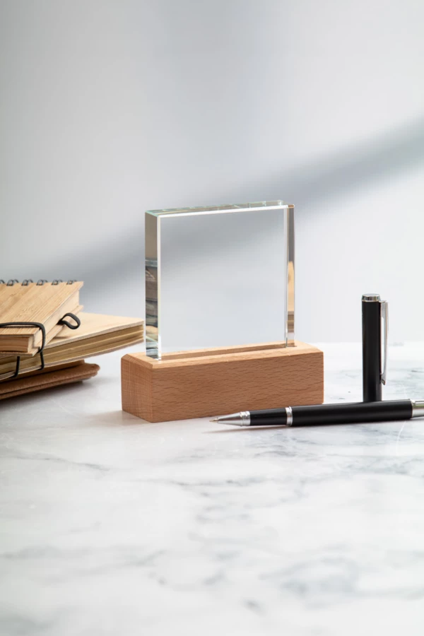 Szklane trofeum z podstawą z drewna bukowego. W pudełku prezentowym z papieru kraft.