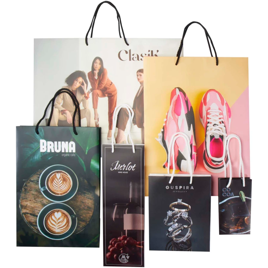 Pudełko zawierające 6 matowych toreb z papieru integra z plastikowymi uchwytami. Dostępne w 6 różnych rozmiarach (9,5 x 4 x 17 cm, 12 x 9 x 37 cm, 18 x 9 x 23 cm, 24 x 9 x 36 cm, 31 x 12 x 41 cm, 45 x 10 x 35 cm). Wykonano w Europie.