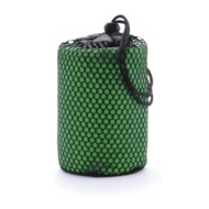 Ręcznik w czarnym, siateczkowym pokrowcu zamykanym na sznurek z klipem, produkt wykonany z mikrofibry o gramaturze 200 g/m2