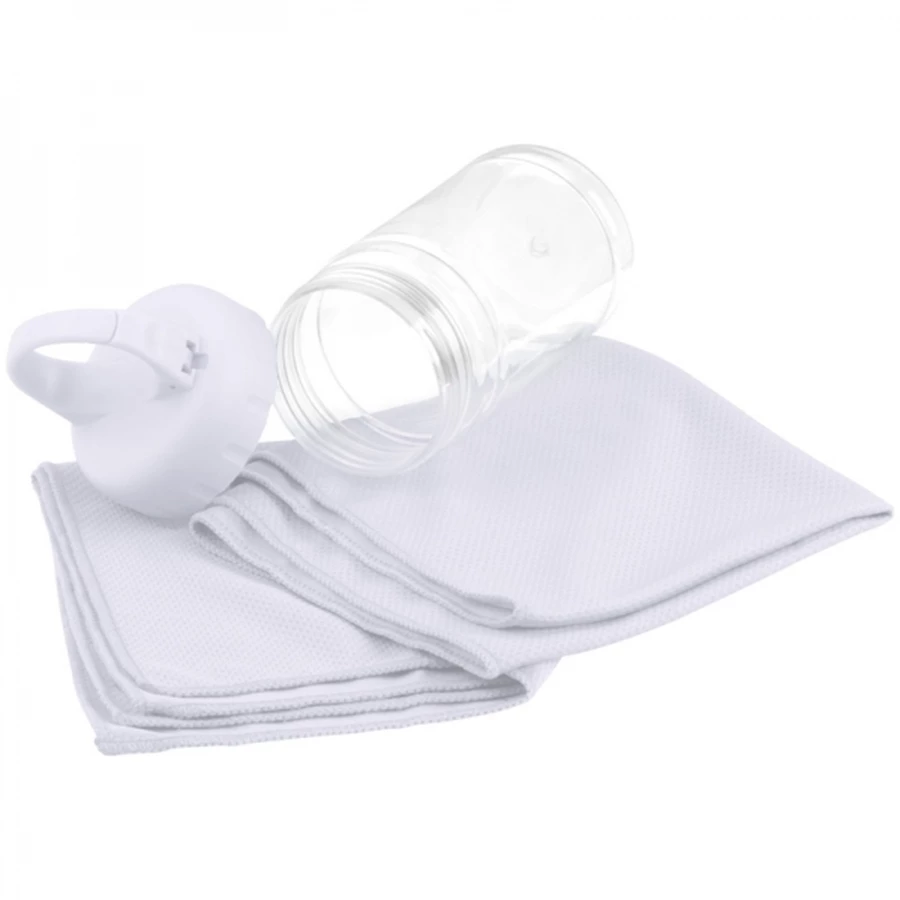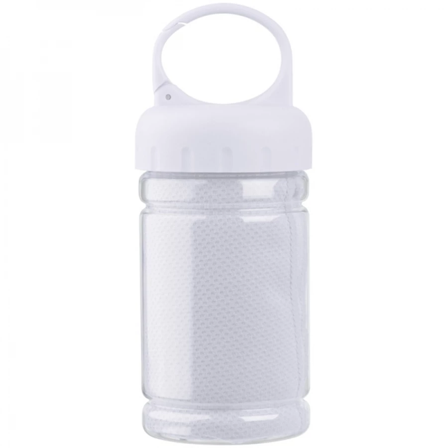 Ręcznik sportowy z szybkoschnącego materiału, umieszczony w plastikowej butelce. Zakrętka butelki ma otwierany uchwyt umożliwiający przypięcie butelki np. do paska od spodni. Ręczniki dostępne w kilku kolorach.Ręcznik 76 x 29 cmButelka 300 ml