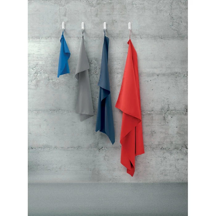 Ręcznik z mikrofibry wykonany w 90% z poliestru i w 10% z poliamidu z elastyczną pętelką na wieszak. Lekki i szybkoschnący.