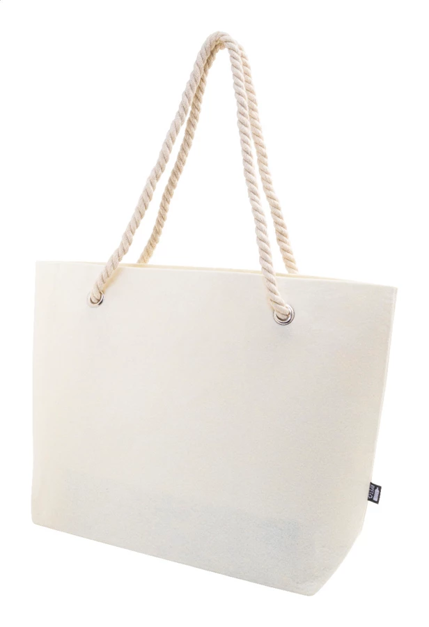 Torba plażowa lub na zakupy z filcu RPET z uchwytami z bawełnianego sznurka i klinem u dołu. Z charakterystyczną metką RPET.
