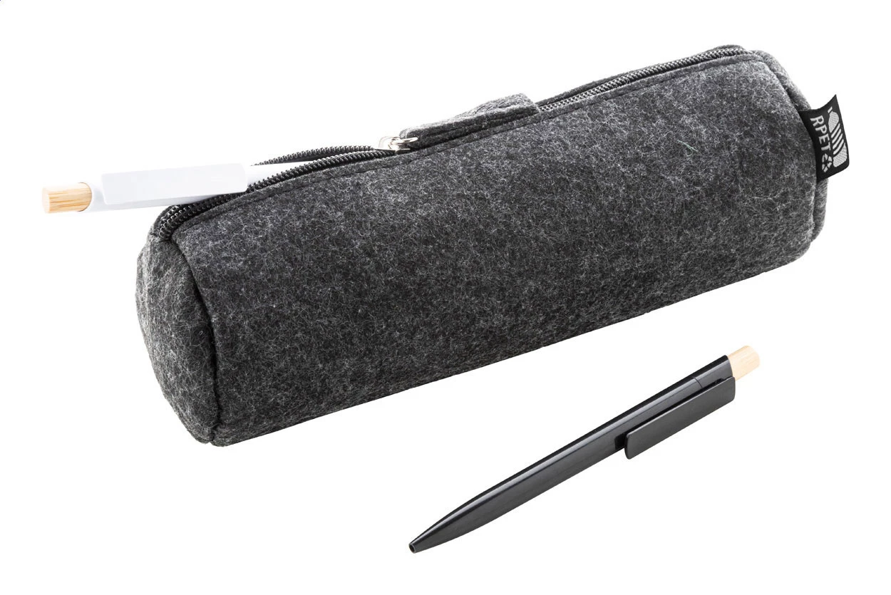 Zapinane na suwak etui na długopis z filcu RPET. Z charakterystyczną metką RPET.