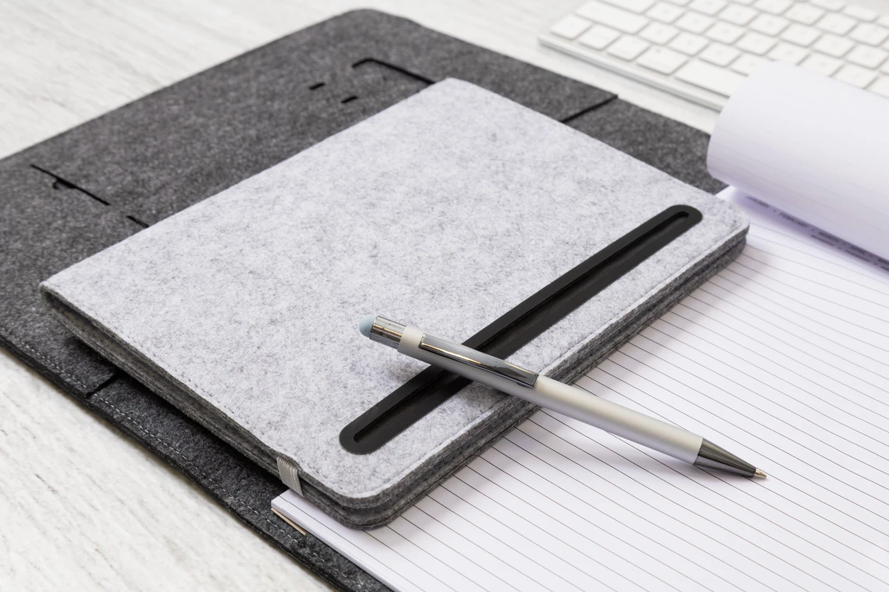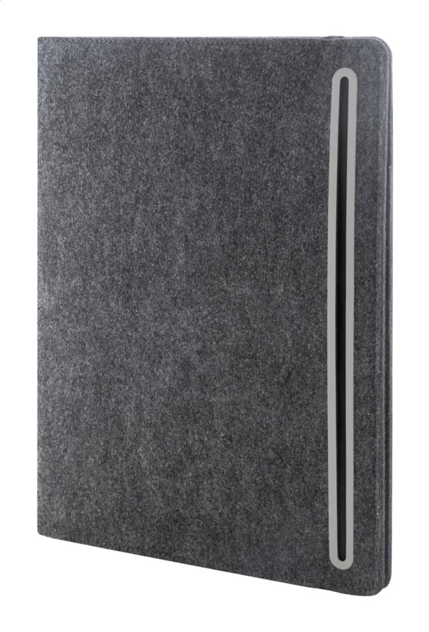 Teczka na dokumenty z filcu RPET w formacie A4 z przednią i wieloma wewnętrznymi kieszeniami organizacyjnymi. Z 20 kartkami w linie z papieru pochodzącego z recyklingu.