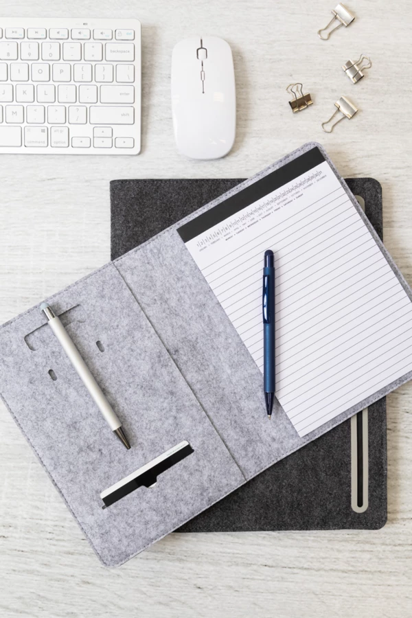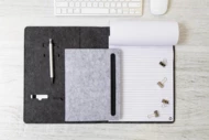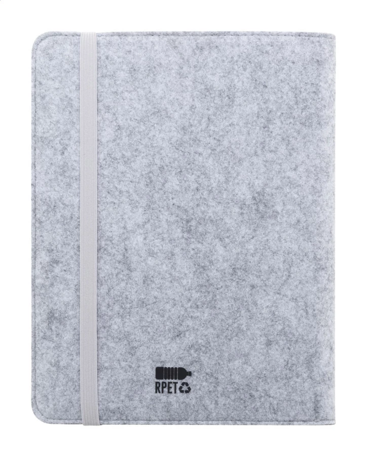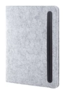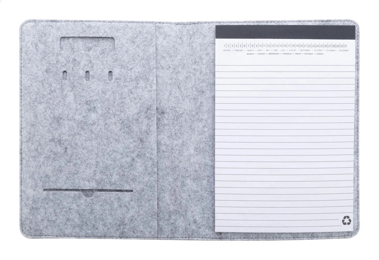 Teczka na dokumenty z filcu RPET w formacie A5 z przednią i wieloma wewnętrznymi kieszeniami organizacyjnymi. Z 20 kartkami w linie z papieru pochodzącego z recyklingu.
