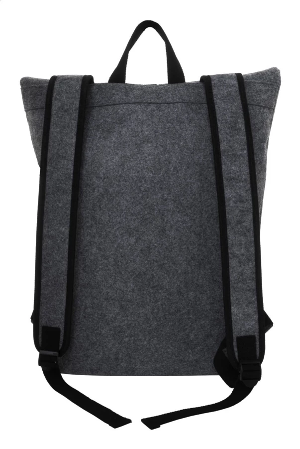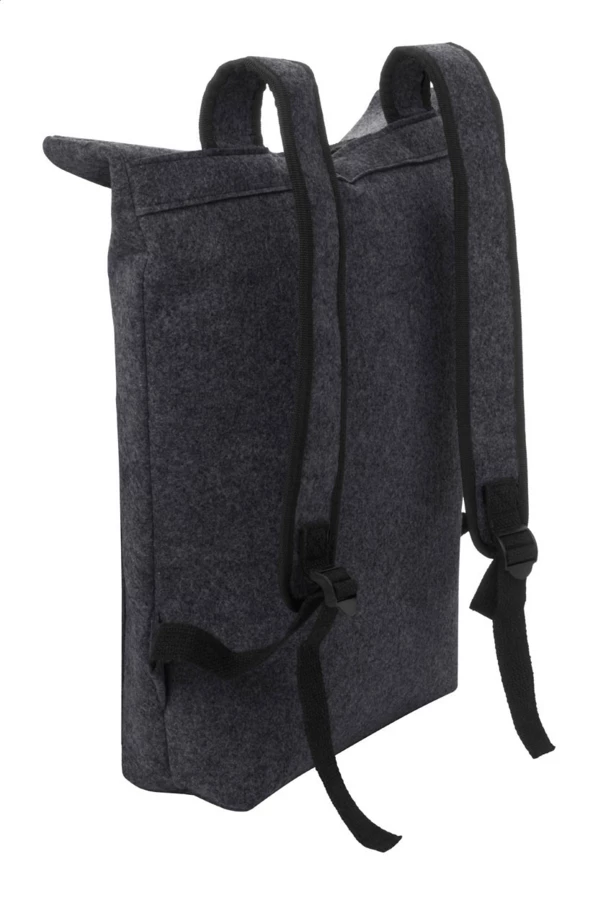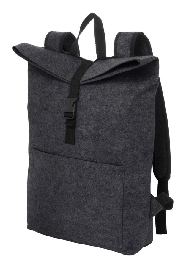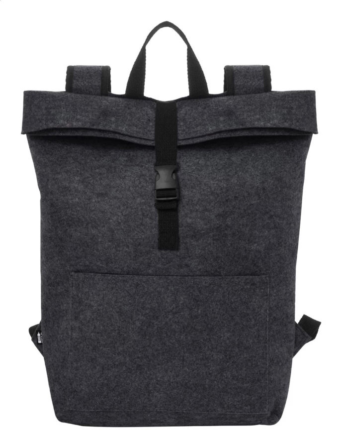 Plecak z filcu RPET z rolowaną górą, zapinaną na klamrę główną kieszenią oraz kieszenią z przodu na suwak, przegrodą na laptopa (15") i wyściełanymi paskami naramiennymi. Z charakterystyczną metką RPET.