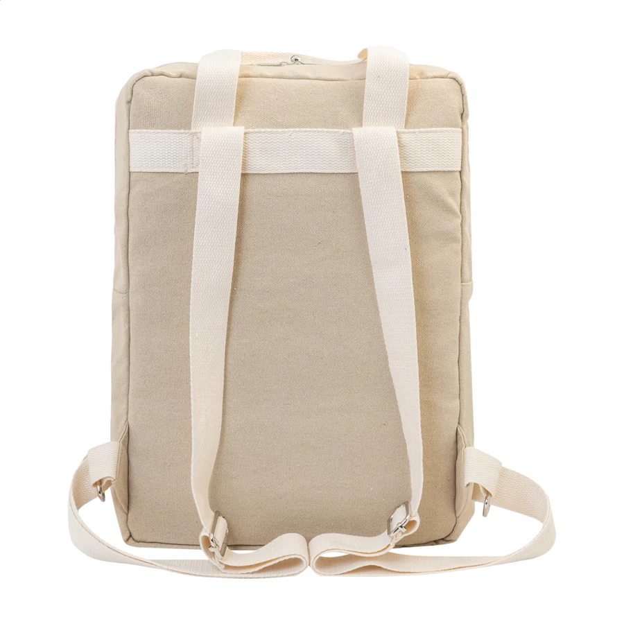 Plecak z płótna z recyklingu z główną komorą zapinaną na zamek, wyściełaną przegrodą na laptopa (13") i przednią kieszenią zapinaną na rzep. Wykonany w 70% z bawełny z recyklingu i w 30% z poliestru RPET. Z charakterystyczną metką z bawełny z recyklingu.