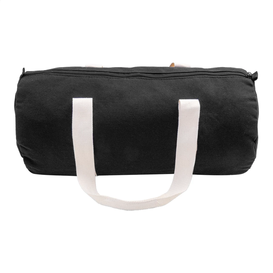 Torba sportowa z płótna z recyklingu z główną komorą zapinaną na zamek, wewnętrzną kieszenią zapinaną na zamek i długimi uchwytami. 70% bawełny z recyklingu i 30% poliestru z recyklingu. Z charakterystyczną metką z bawełny z recyklingu.