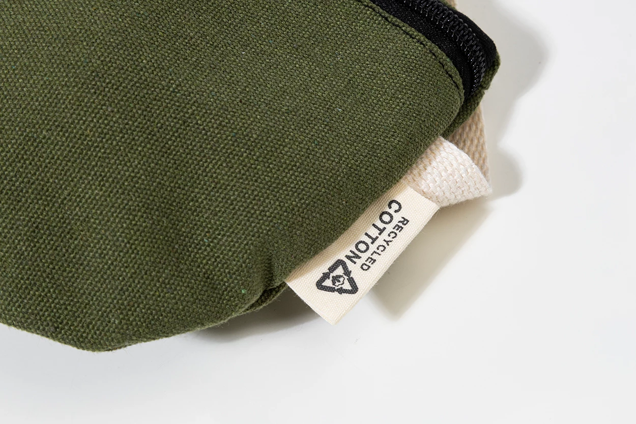 Torba biodrowa z płótna z recyklingu, z przegrodą na zamek i regulowanym paskiem. 70% bawełny z recyklingu i 30% poliestru z recyklingu. Z charakterystyczną metką z bawełny z recyklingu.