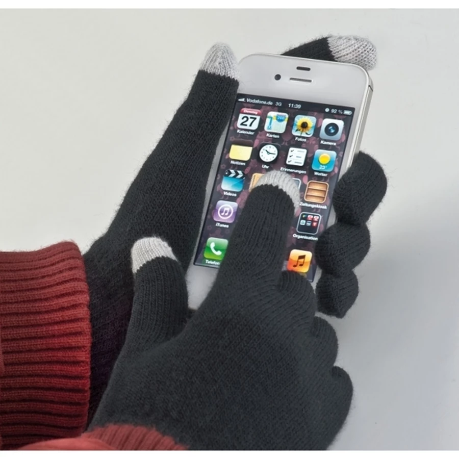 Rękawiczki z miękkiego akrylu. W miejscu kciuka i palca wskazującego wykonane są ze specjalnego tworzywa, dzięki któremu można obsługiwać w nich ekrany dotykowe.