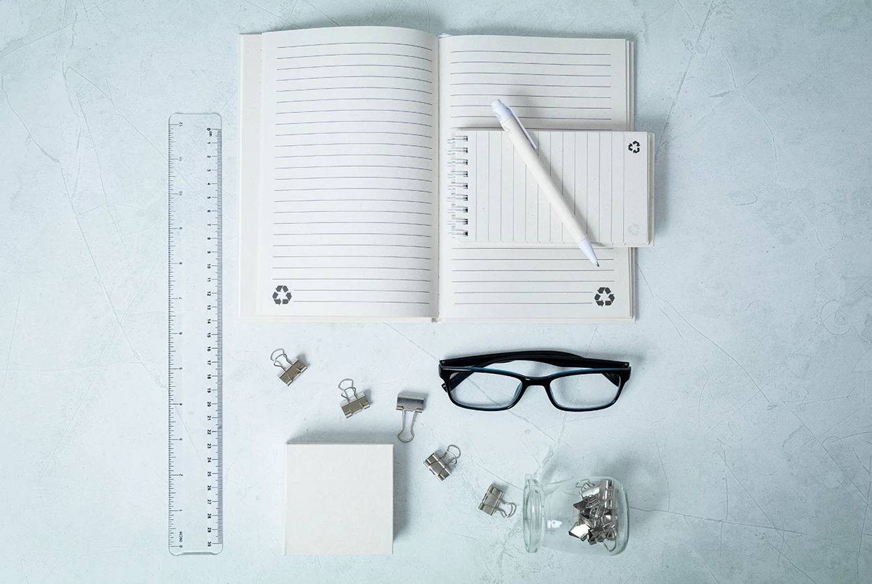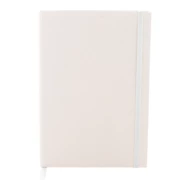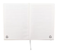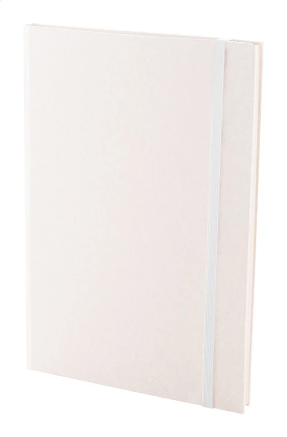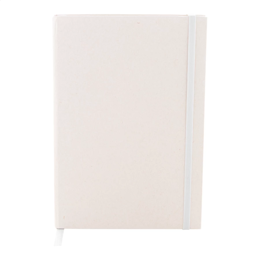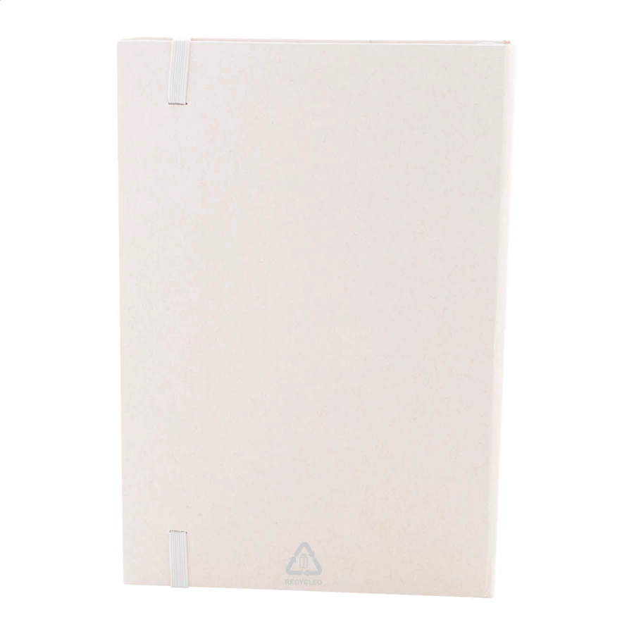 Notes z papieru z recyklingowanego kartonu po mleku, z twardą okładką, 80 kartkami w linie i dopasowaną kolorystycznie gumką. Rozmiar A5.