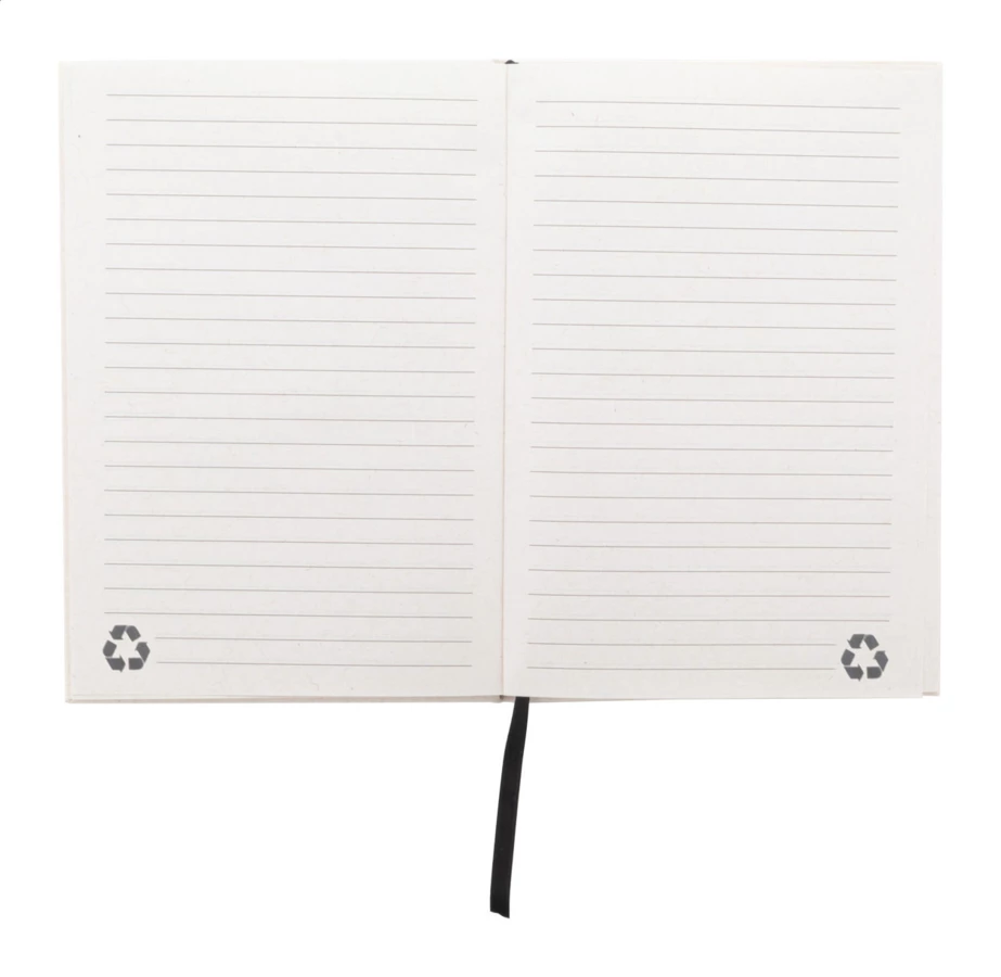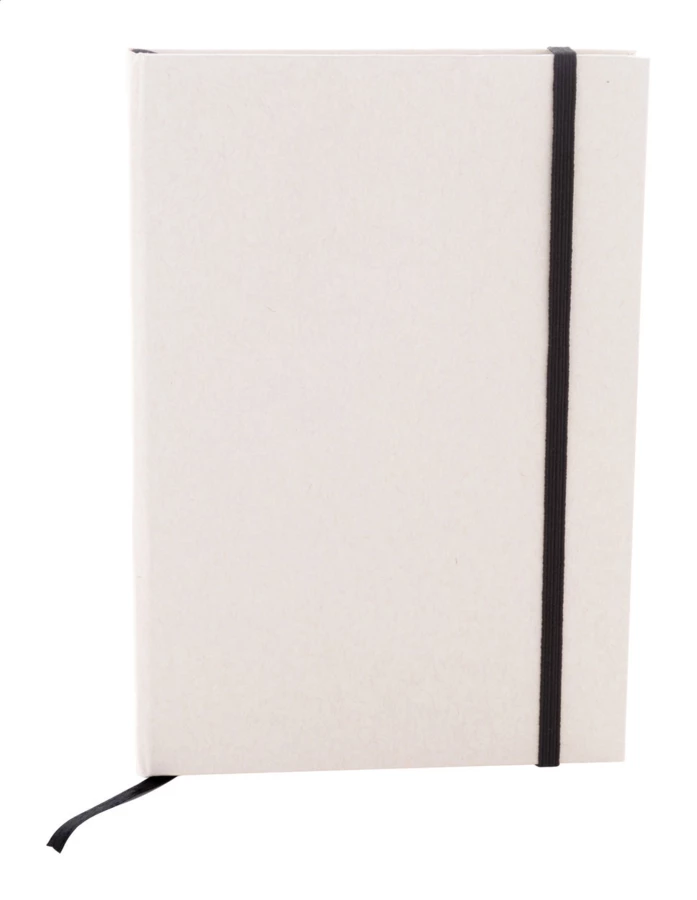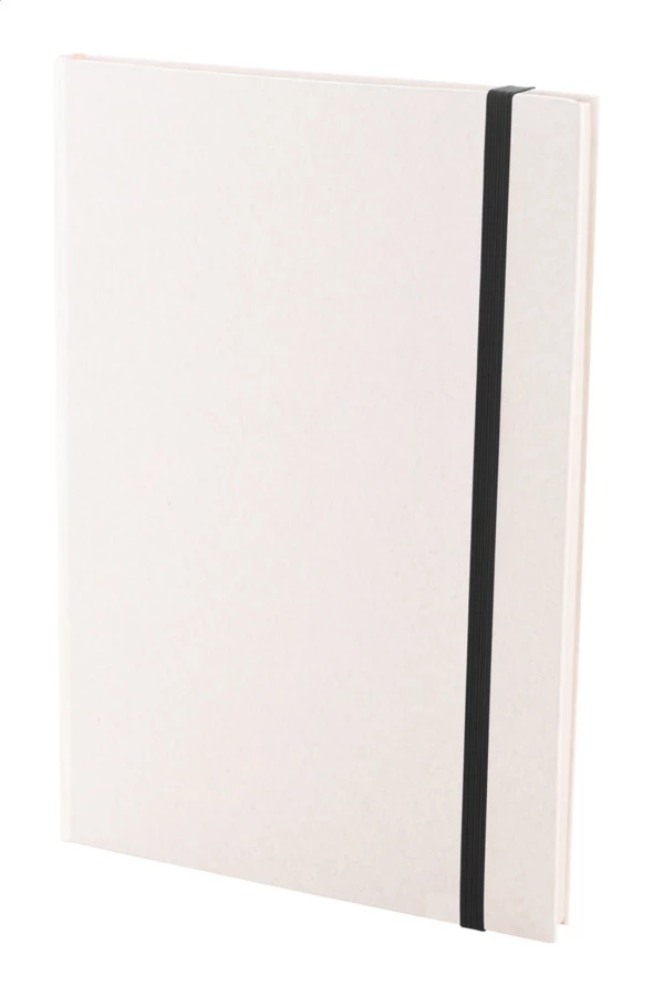 Notes z papieru z recyklingowanego kartonu po mleku, z twardą okładką, 80 kartkami w linie i dopasowaną kolorystycznie gumką. Rozmiar A5.