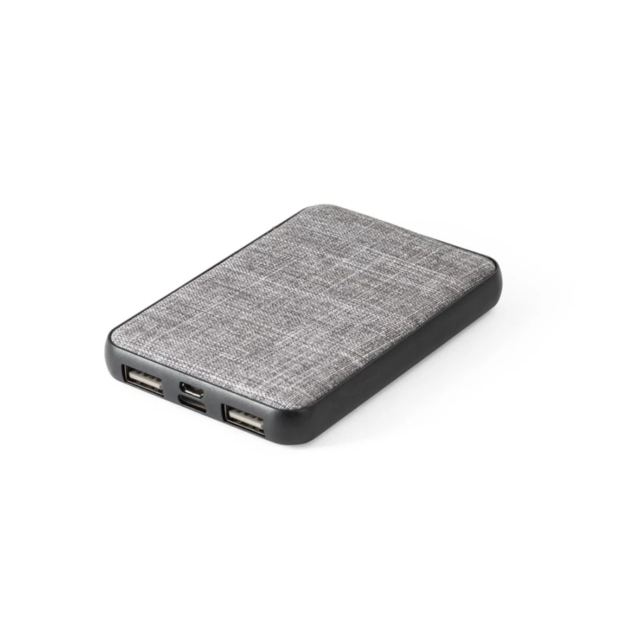 Power bank wykonany w PET pochodzącego z recyklingu (100% rPET). Przenośna bateria o pojemności 5000 mAh, jeden port wejściowy microUSB, jeden port USB-C i dwa porty wyjściowe USB-A. W zestawie kabel MicroUSB do ładowania. Dostarczany w pudełku prezentowym z papieru pakowego. 65 x 98 x 10 mm